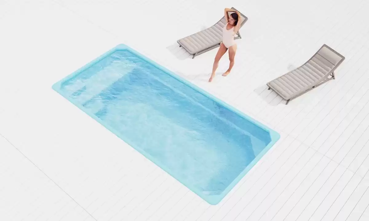 Спуск продуман максимально удобно: одна широкая ступень-подиум и две компактные позволяют безопасно заходить в воду взрослым и детям. При этом вся остальная длина чаши остается свободной для плавания.